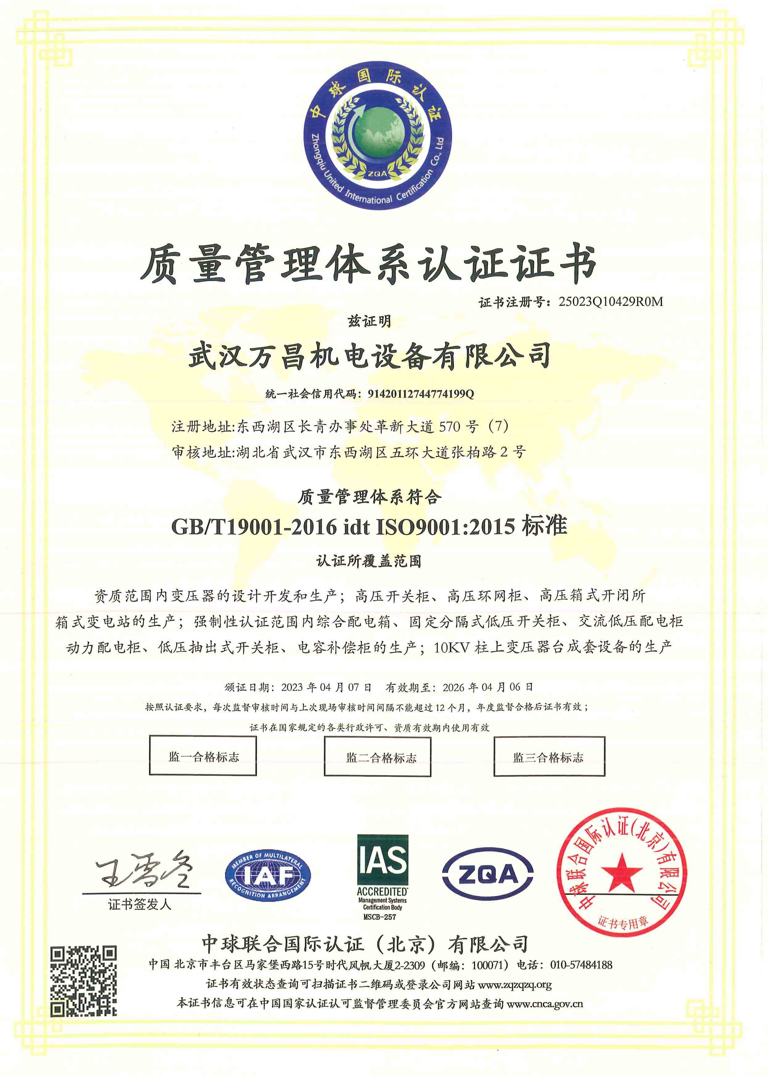 - 質量管理體系認證證書